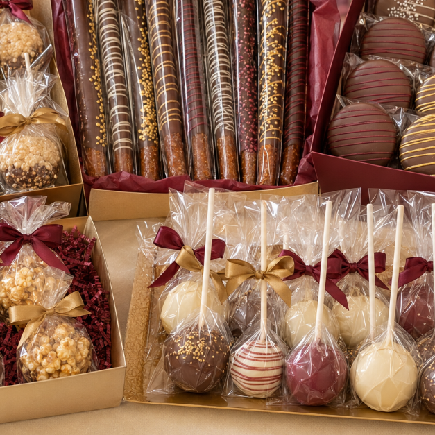 Rice Crispy Pops, chocolate-covered pretzels (dark, milk, white yogurt), chocolate enrobed Oreos (lemon, chocolate, mint), gourmet popcorn balls and cake pops (vanilla, chocolate, strawberry & red velvet)